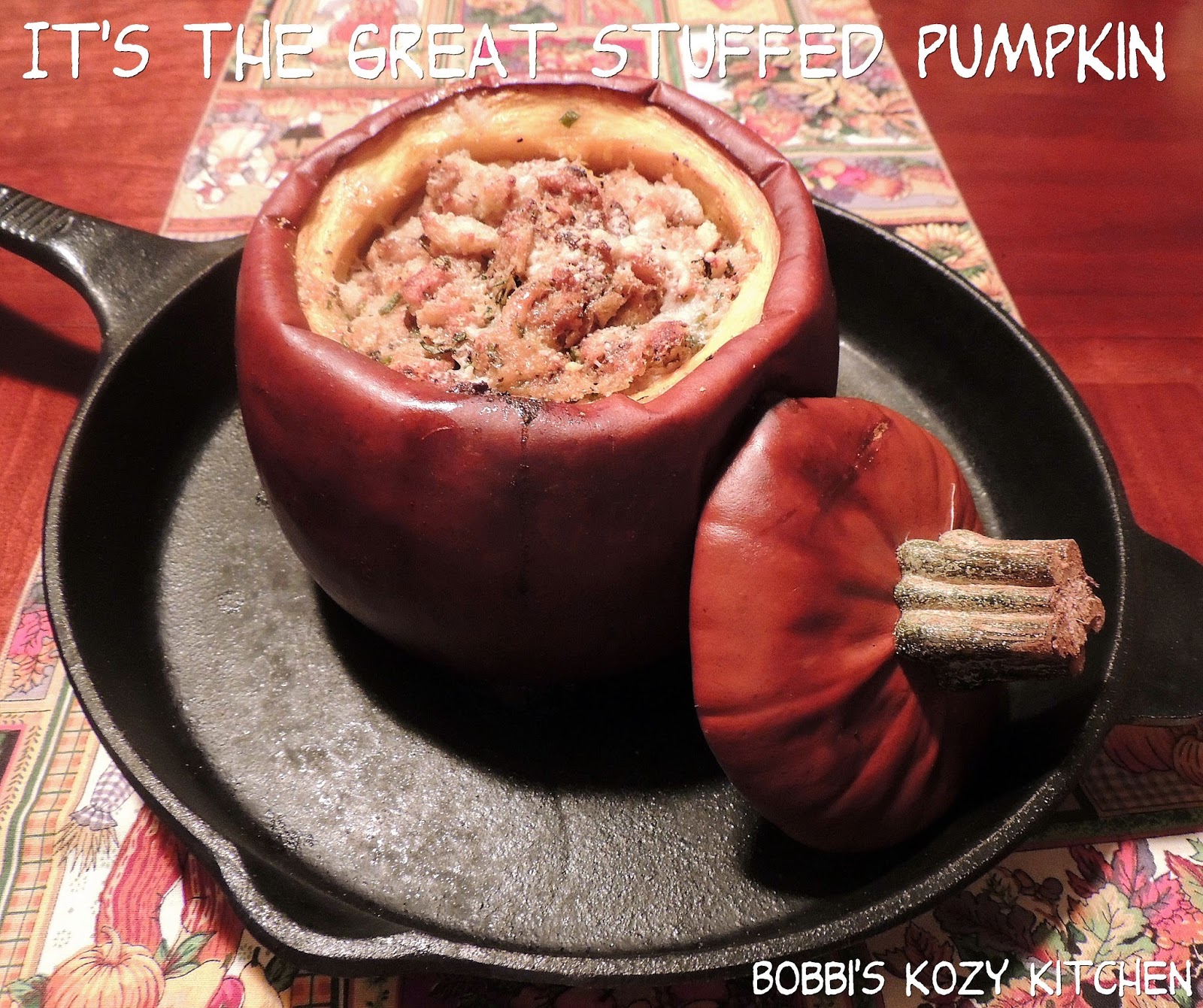 Put the cap in place and bake the pumpkin for about 90 minutes, the flesh of the pumpkin should be tender enough to be pierced easily with the tip of a knife. Remove the cap and sprinkle with a bit of Parmesan cheese. Cook an additional 20 to 30 minutes, so that the liquid can bake away and the top of the stuffing can brown a little.